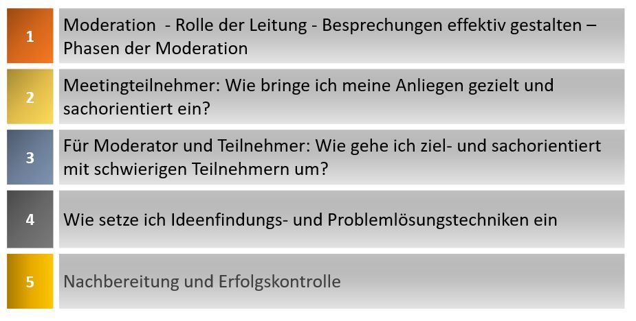 Im Moderationsseminar geht es sachgerechte Besprechungen.Es geht um die Frage, wie ich mich als Leiter und auch als Teilnehmer richtig verhalte und wie alle in einer begrenzten Zeit zu einem für alle Seiten guten nachhaltigen Ergebnis kommen.