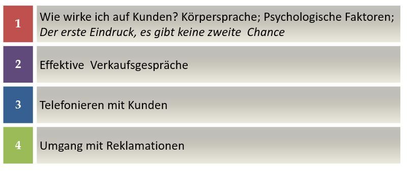 Im 1. Teil des Seminares werden wir über „beraten, verkaufen und verhandeln“ mit Kunden sprechen. Dabei geht es darum: Wie wirke ich auf Kunden? Wie spreche ich Kunden an? Wie führe ich sachgerechte und effiziente Kundengespräche.