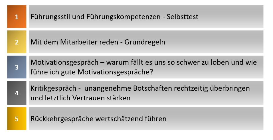 Führen Sie daher als Führungskraft kritische Gespräche (Ermahnungsgespräche) klar, wertschätzend und zielgerichtet und nutzen Sie diese als Motor für Entwicklung und Verbesserung. Geben Sie der jeweiligen Gesprächssituation einen angemessenen Rahmen. Steuern Sie die Kommunikation mit professionellen Gesprächstechniken und erreichen Sie so gezielt auch bei schwierigen Themen eine konstruktive Wirkung. Das Seminar vermittelt auch arbeitsrechtliche Grundlagen, die jede Führungskraft kennen sollte.