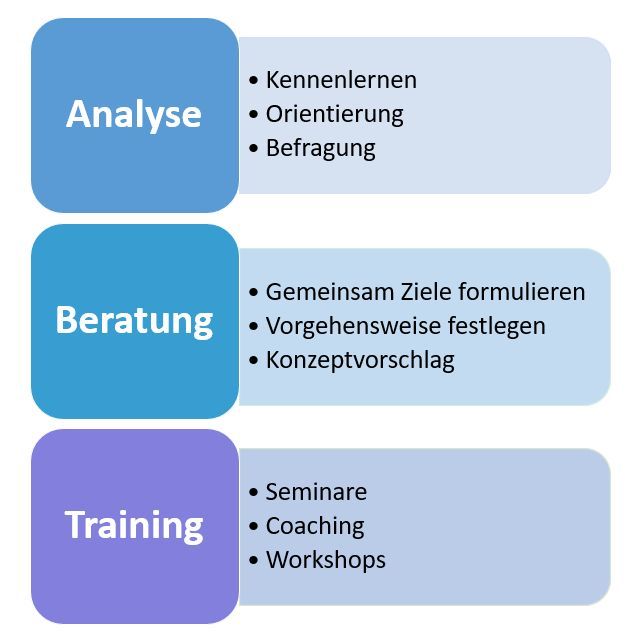 Wir haben uns auf 3 Leistungsfelder spezialisiert: Analyse~Beratung~Training